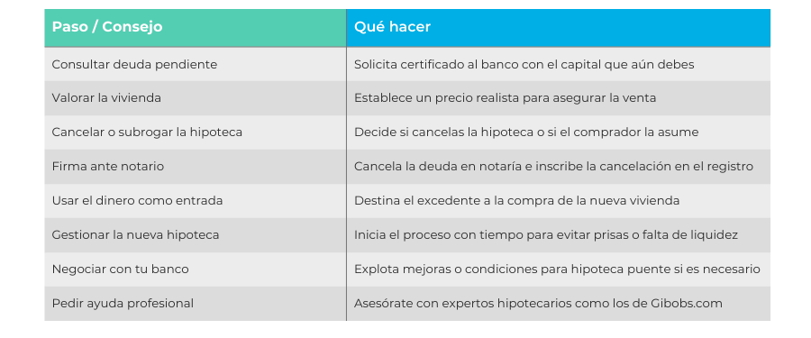 Aquí te dejamos una tabla resumen con los consejos para vender una casa con hipoteca para comprar otra: