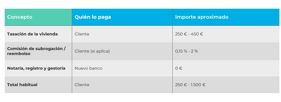 3. Otros gastos (notaría, registro, gestoría). Corren a cargo del nuevo banco, no del cliente.