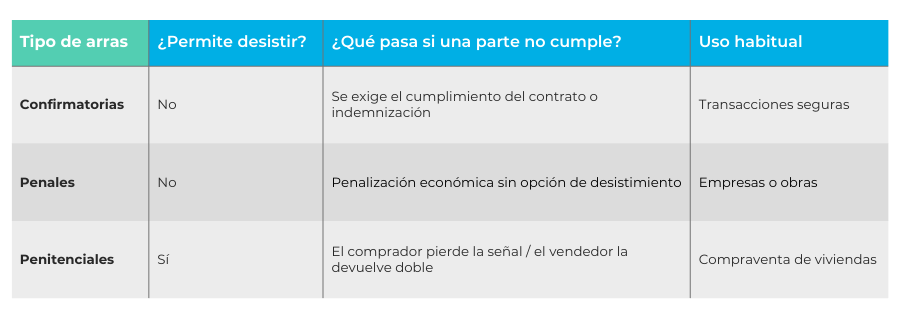 - Arras penitenciales (las más comunes): Permiten desistir del contrato, pero con penalización. Es decir, el comprador pierde la cantidad entregada si desiste, y el vendedor debe devolverla duplicada si se echa atrás.