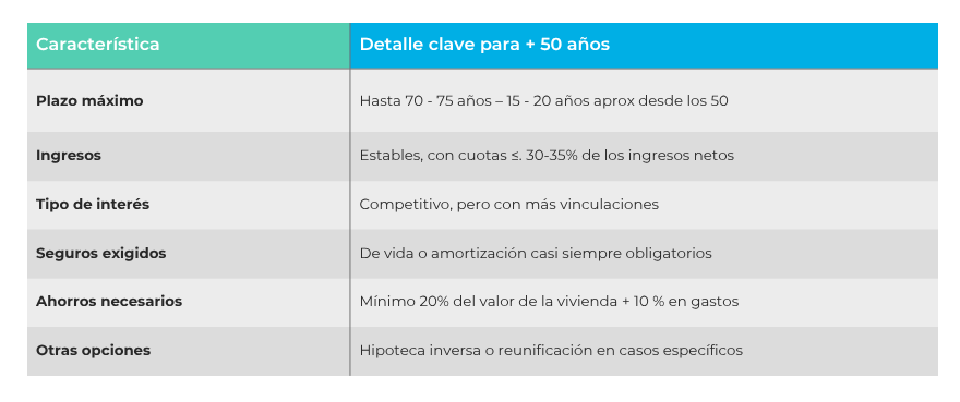 Aquí te dejamos una tabla resumen de las características de la hipoteca para mayores de 50 años: