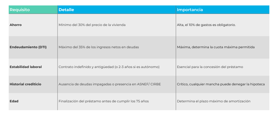 Te dejamos una tabla a modo de resumen para que veas todos los requisitos para conseguir una hipoteca: