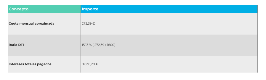 El DTI es muy bajo, indicando una alta capacidad de pago. Al ser un plazo corto, el pago de intereses es muy reducido, y el banco consideraría este préstamo de riesgo mínimo, lo que permite negociar un TIN aún más bajo.