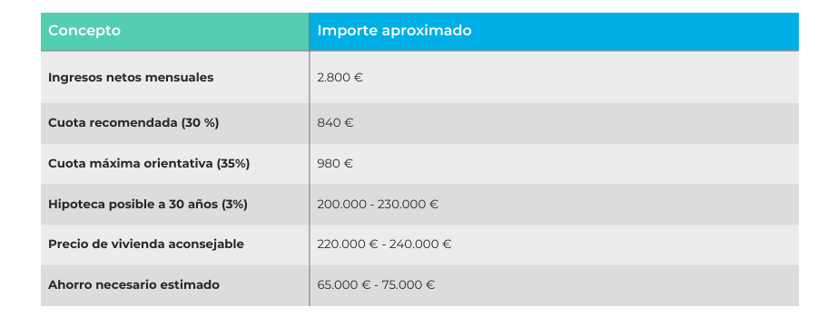 Esto significa que, para que la operación sea cómoda y tenga más probabilidades de aprobación, la cuota mensual debería situarse aproximadamente entre 840 € y 980 €. Aunque algunos bancos pueden aceptar cuotas algo más altas en perfiles muy sólidos, ir al límite no suele ser recomendable para la pareja, ya que deja poco margen para imprevistos.