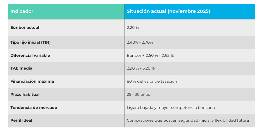 En otoño de 2025, el Euríbor se mantiene en torno al 2,20 %, mientras los tipos fijos tienden a estabilizarse. Por ello, las hipotecas mixtas muestran un rango de interés muy competitivo en comparación con las puramente fijas o variables.