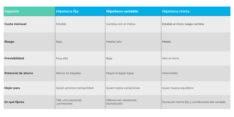 Para que entiendas claramente los tres tipos de hipotecas que existen, aquí te dejamos una tabla comparativa: