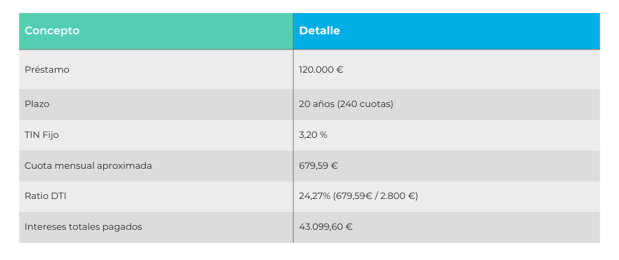 La cuota de 679,59 € es perfectamente asumible, pues deja un amplio margen de seguridad (el DTI está muy por debajo del límite del 35%). Con 45.000 € ahorrados, el banco aprobaría la operación con este perfil.