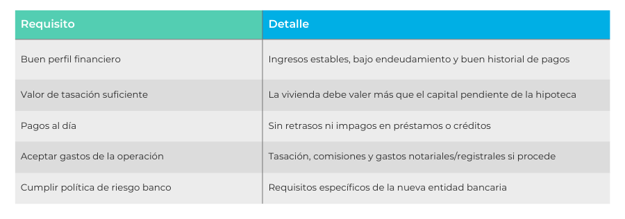 Aunque es posible hacerlo, el banco que te conceda la nueva hipoteca te pedirá que cumplas ciertas condiciones. Estos son los requisitos más habituales: